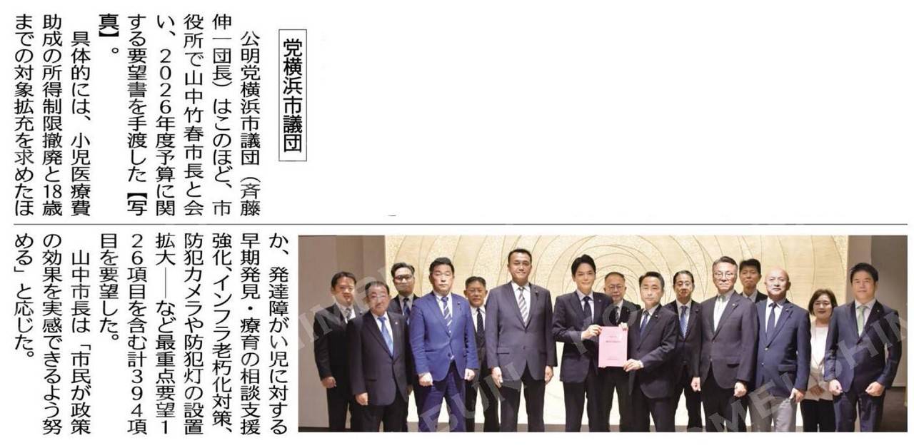 公明市議団要望に市長「しっかり対応」と大きく掲載。来年度実施へ動き出します。